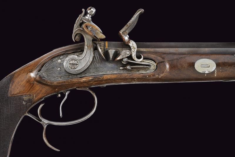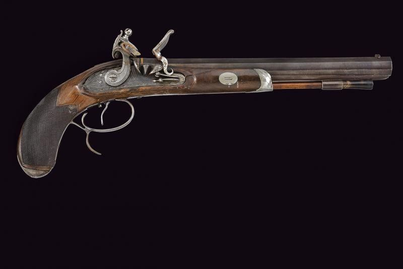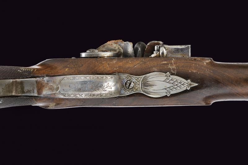 lunghezza 40.5 cm. Canna ottagonale liscia, brunita; la culatta con cornice e marca di Silk in oro. Mirino, cal. 10 mm; codetta incisa e munita di alzo brunito. Batteria a pietra focaia firmata 'I. SILK', incisa a motivi floreali e munita di sistema antifrizione e a tenuta stagna. Mezza cassa (due restauri) in legno con calcio zigrinato; fornimenti in ferro decorato en suite. Ponticello con poggiadito, grilletto con stecher. Bacchetta in legno con battipalla in corno.