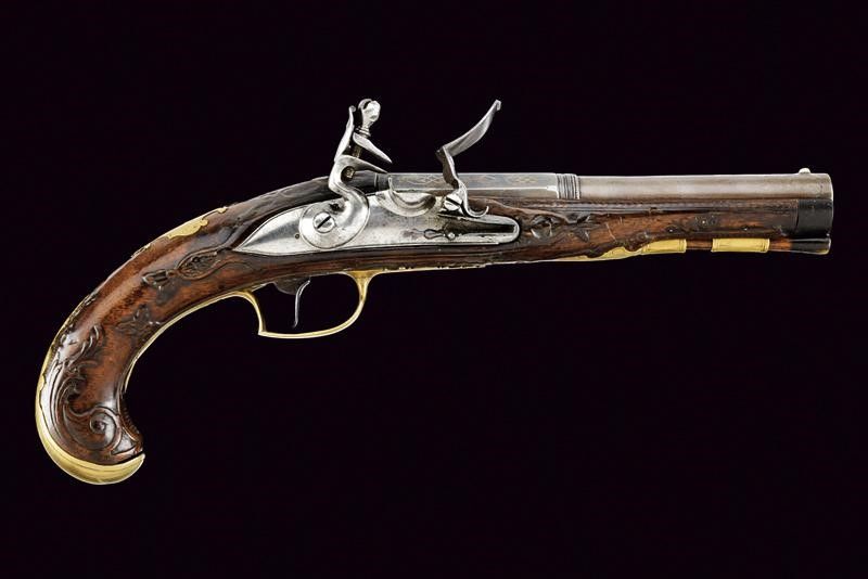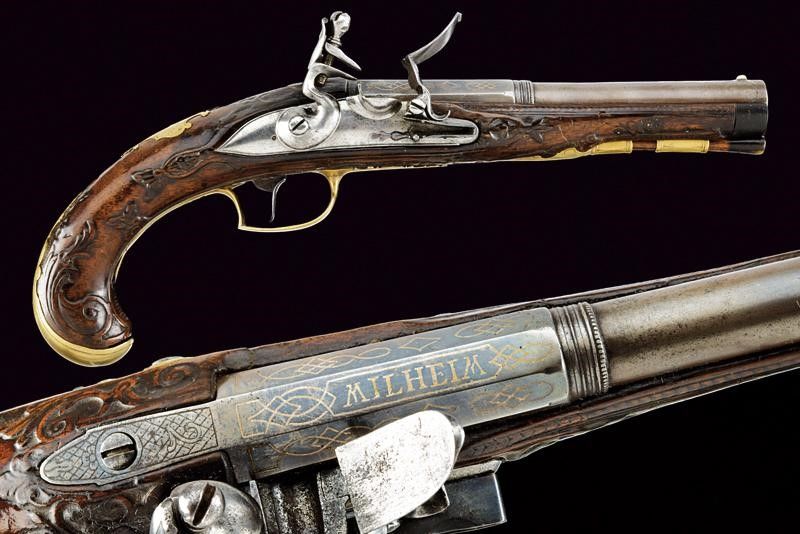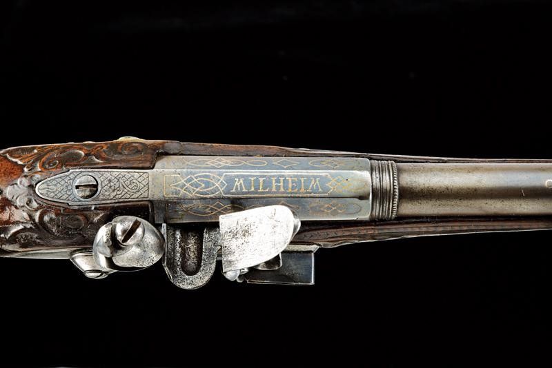 lunghezza 32 cm. Canna rigata a due ordini; la prima parte ottagonale, con firma 'MILHEIM' e decorazioni in ottone su fondo brunito; la seconda parte tonda con anellature al cambio, e munita di mirino e decorazioni in argento, cal. 13 mm. Codetta incisa e numerata '2'. Batteria a pietra focaia con cartella tondeggiante. Cassa intera in legno scolpita a motivi floreali; piccoli restauri al di sotto della canna. Fornimenti in ottone incisi a motivi floreali, la coccia anche con trofeo, sul dorso uno scudetto con monogramma sormontato da corona regia. Bacchetta in legno con battipalla in corno.