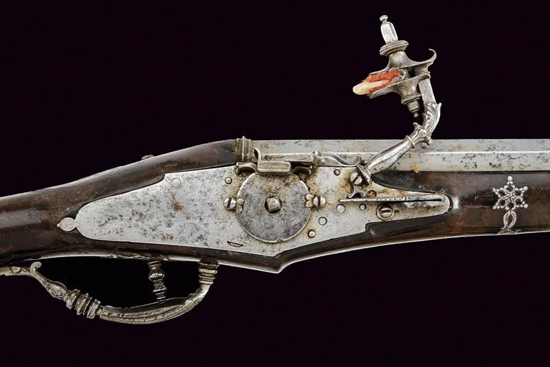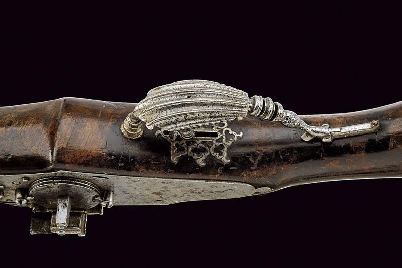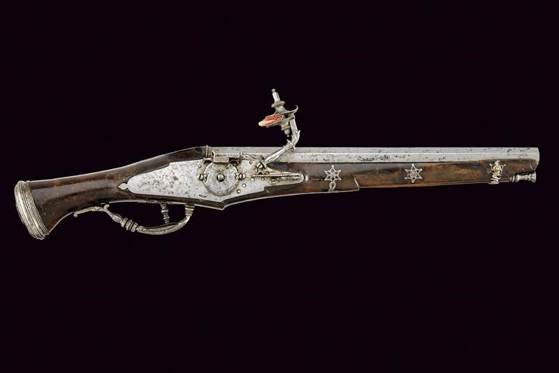 lunghezza 48 cm. Canna ottagonale liscia, con cornice alla culatta, cal. 14 mm. Batteria a ruota esterna con cartella piatta munita di copriscodellino scorrevole e cane intagliato a motivi floreali, all'interno marca ovale 'IS' sotto tre stelle. Cassa intera in legno (piccoli restauri e segni d'uso e del tempo) con fornimenti in ferro parzialmente traforati, il ponticello decorato a scanalature e a balaustro (alcuni danni da ruggine). Gancio da cintura con punta traforata. Bacchetta in legno con battipalla in ferro.