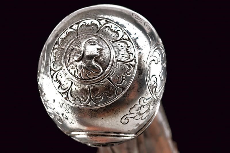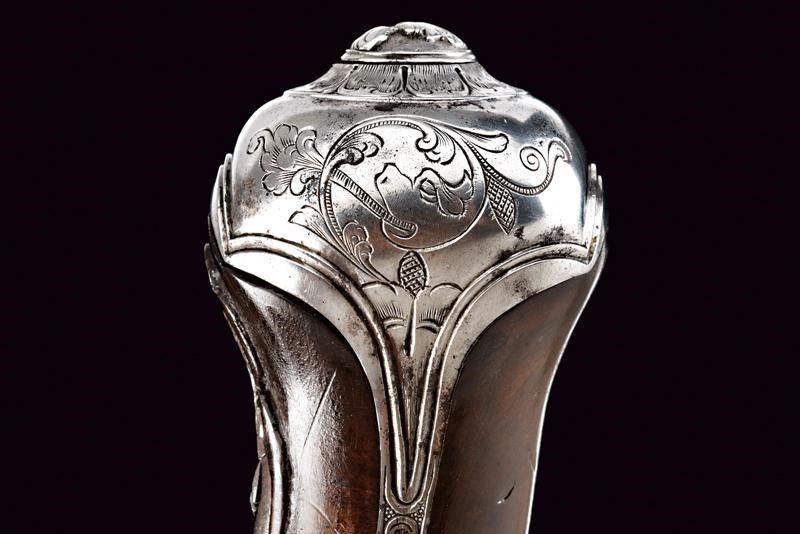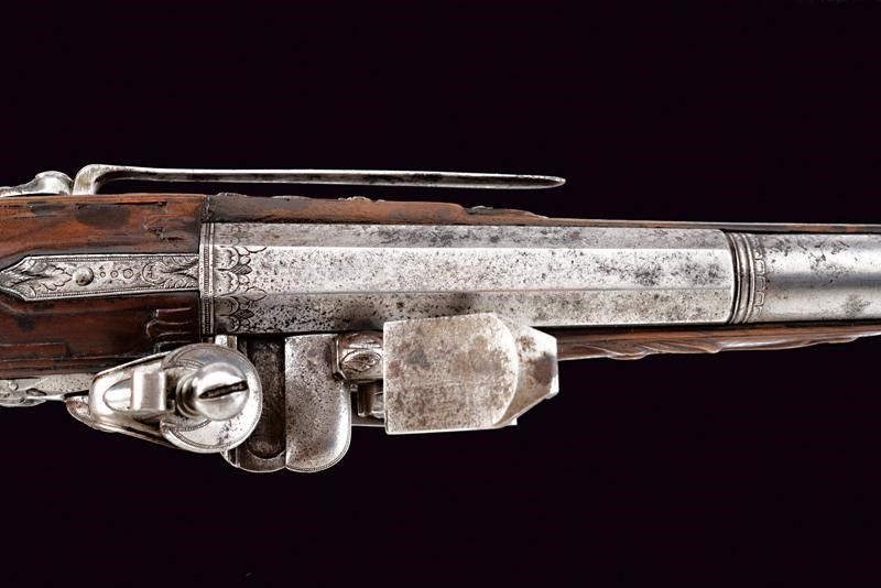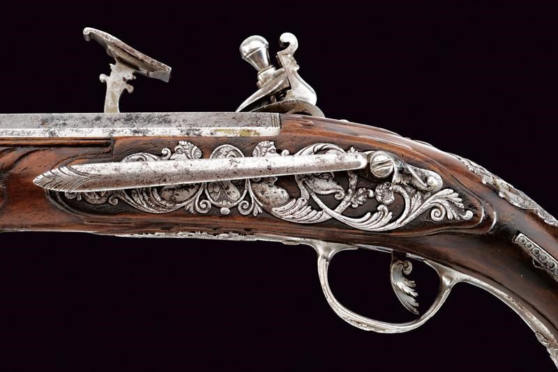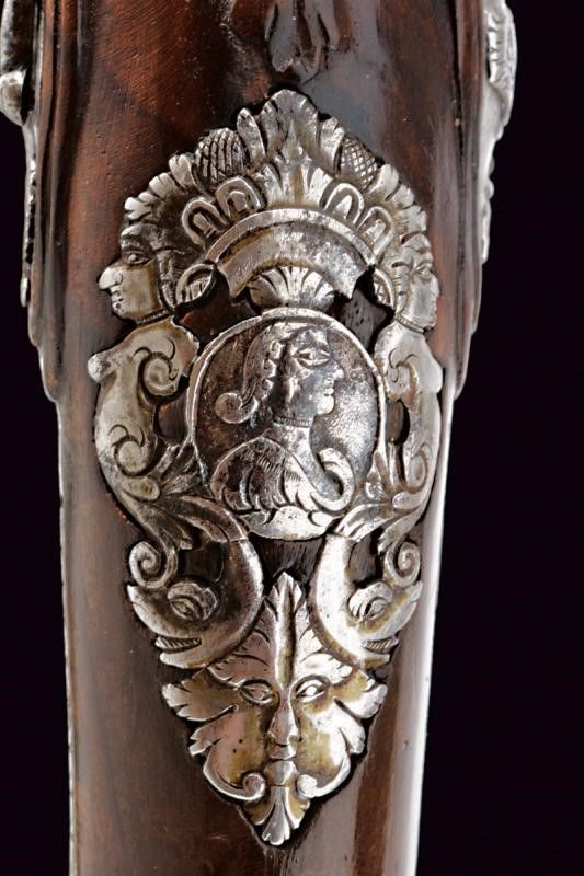 lunghezza 34.5 cm. Canna liscia a due ordini, prima ottagonale e poi tonda, con decorazioni floreali alle estremità; cal. 12 mm. Codetta incisa. Batteria a pietra focaia riccamente intagliata con busti, mascheroni, serpente e a motivi floreali; copriscodellino scorrevole. La cartella firmata e datata all'interno 'Giuseppe Guardiani / 1791'. Cassa intera in legno leggermente intagliato. Bei fornimenti in acciaio decorati a busti, serpenti e a racemi; gancio da cintura. Bacchetta in legno.
