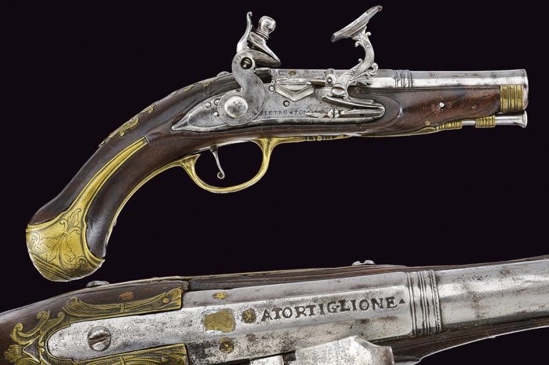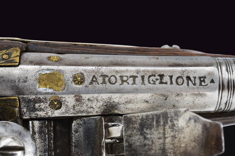 lunghezza 24 cm. Canna liscia a due ordini; la prima parte ottagonale con resti di marca rimessa in ottone fra tre fiori, firmata 'A TORTIGLIONE', la seconda parte tonda, con anellature al cambio, cal. 12 mm. Batteria a cartella piatta con bordi obliqui firmata 'PIETRO TOMASI', la martellina intagliata ed incisa, copriscodellino scorrevole. Cassa intera in legno (piccoli restauri e mancanze) con fornimenti in ottone incisi a teste di uccelli e motivi floreali, sul dorso scudetto con corna e giglio. Bacchetta in ferro dotata di cavastracci.