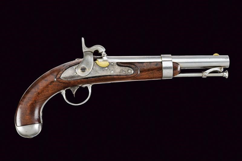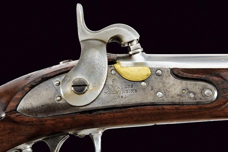 USA, lunghezza 34,5 cm. 1841 Canna tonda liscia con culatta punzonata 'US / JH / P'. Cal. 54 in volata, lunga 8-1/2'. Mirino in ottone, codolo con traguardo a sella. Batteria marcata con emblema a testa d'aquila sormontante la dicitura 'A.WATERS / MILBURY MS' e con data '1841'; punzone 'B'. Riduzione a luminello con meccanica ben funzionante. Cassa a tre quarti in legno con timbri d'ispezione militare ben visibili sul lato sinistro. Fornimenti in ferro. Bacchetta a snodo. Lievi intaccature.