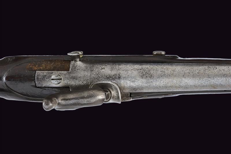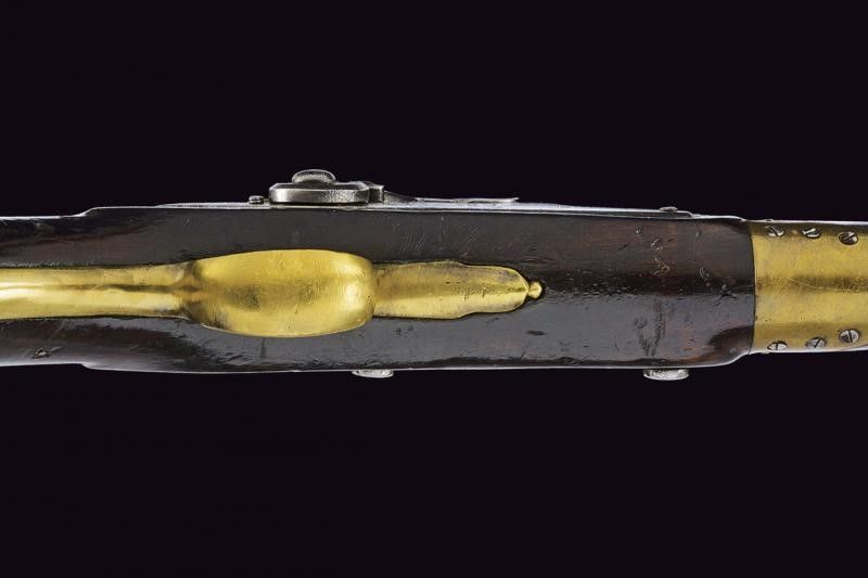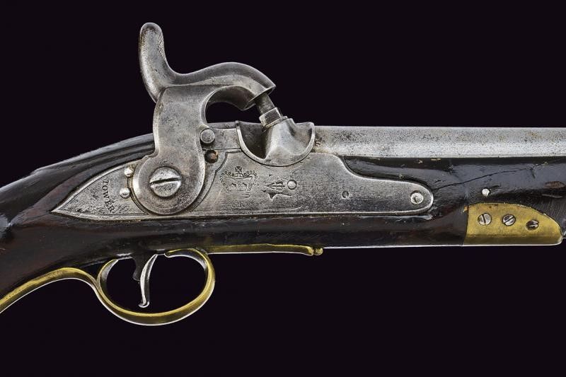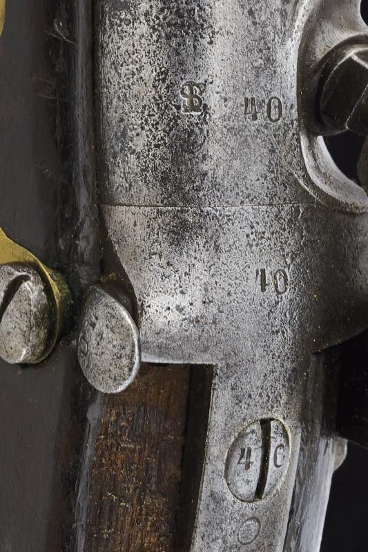 Canna tonda liscia con resti di punzoni e numerazioni alla culatta, dotata di mirino in ferro, cal. 16,6 mm. in volata. Batteria ridotta a luminello, con cartella recante la sigla 'GR' (Re Giorgio) coronata, e Broad Arrow coronata; marcatura 'TOWER' alla codetta. Cassa intera in legno bruno (due piccole crepe e un tassello mancante), con resti di numerazioni coeve alla canna. Fornimenti in ottone, bacchetta in ferro a snodo. Dotata di sicura a perno, da estrarre sopra alla contropiastra per liberare il cane.