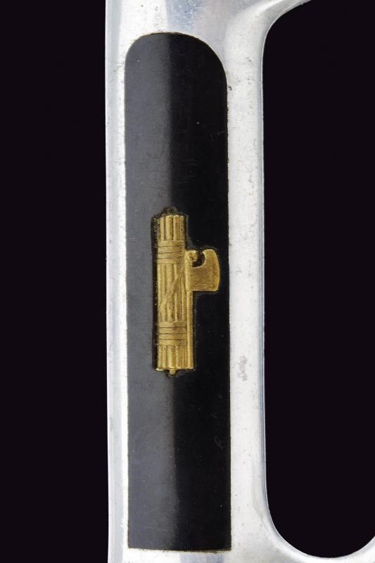 lunghezza 30 cm. Secondo quarto del XX Secolo Lama dritta a un filo e controfilo (zone con ruggine); impugnatura in alluminio a testa d'aquila; guancette nere e fascio littorio in ottone. Fodero annerito (difetti) con fornimenti in ottone e due anelli di sospensione.