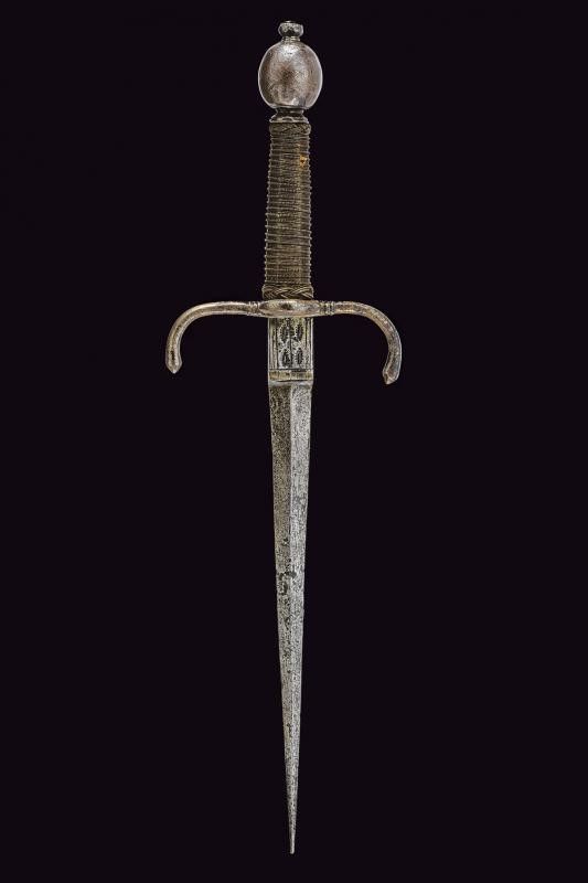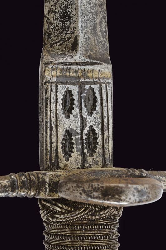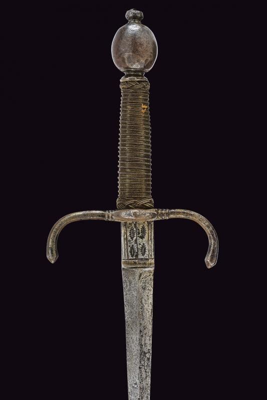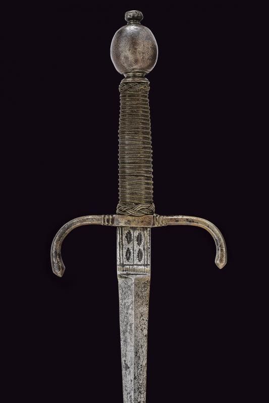 lunghezza 40 cm. Robusta lama dritta a due fili costolati a sezione romboidale, il tallone rettangolare e decorato con pigne e doppie linee. Fornimento in ferro con bracci incurvati verso la lama, piccolo anello da parata, pomo ovale con collo rastremato. Impugnatura in legno con trecciola e teste di moro in filo di ferro (probabilmente di epoca successiva).