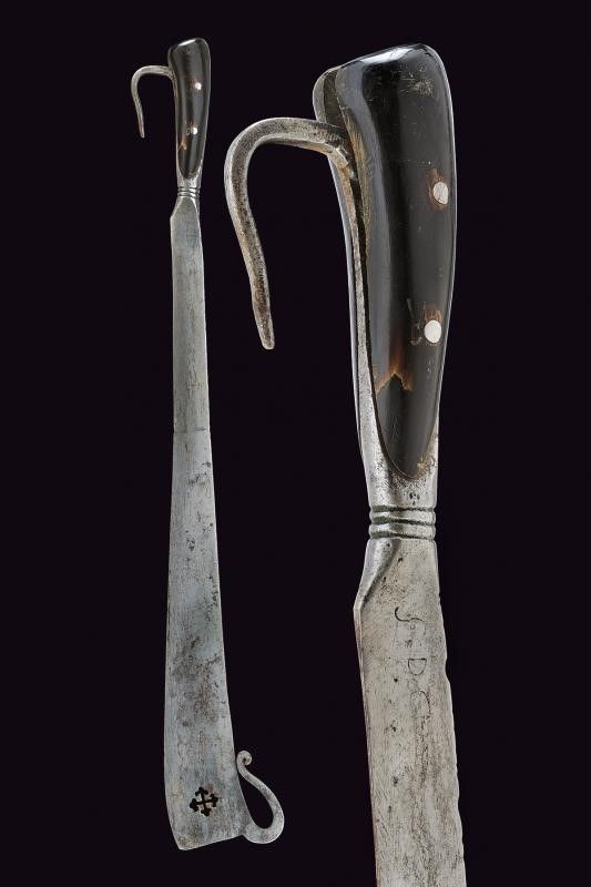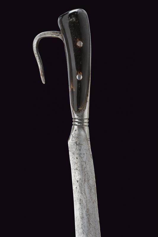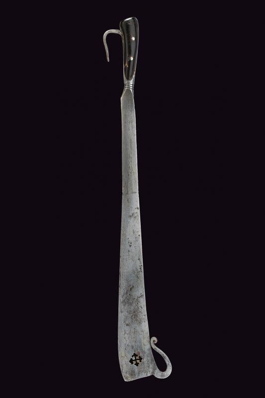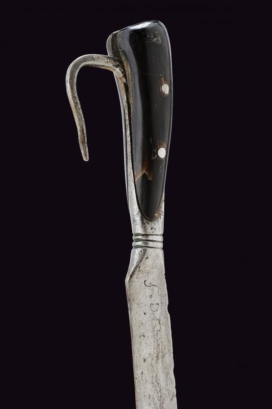 lunghezza 69.5 cm. Robusta e lunga lama, crescente verso il debole, a un filo, con punta traforata recante l'ordine dei Santi Maurizio e Lazzaro, dotata di grande ricciolo sul dorso, il quale è intagliato nella prima parte; la base marcata 'SDC'. Impugnatura tipica con guancette in corno e gancio in ferro.