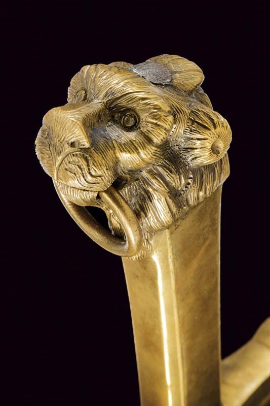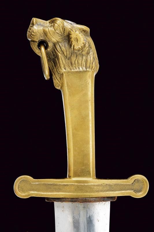 lunghezza 60 cm. Metà del XIX Secolo Larga lama dritta a due fili con scanalatura centrale. Fornimento in ottone massiccio con pomo a testa di leone recante anello nelle fauci. Fodero in cuoio con fornimenti in ottone. Modello usato in seguito dai pompieri.