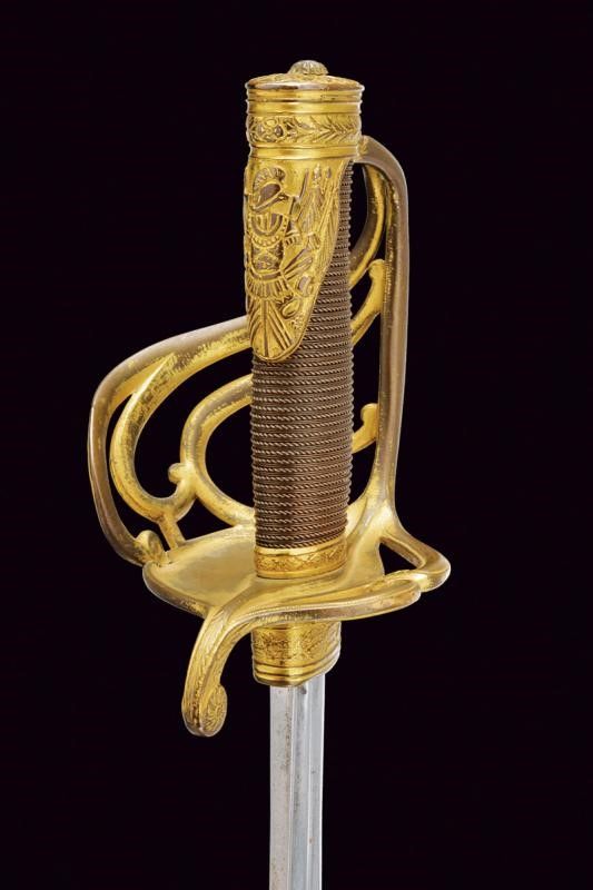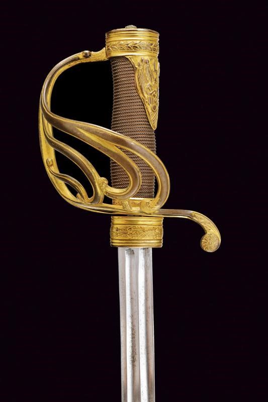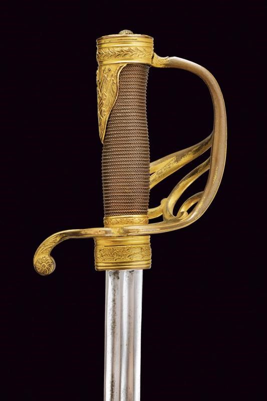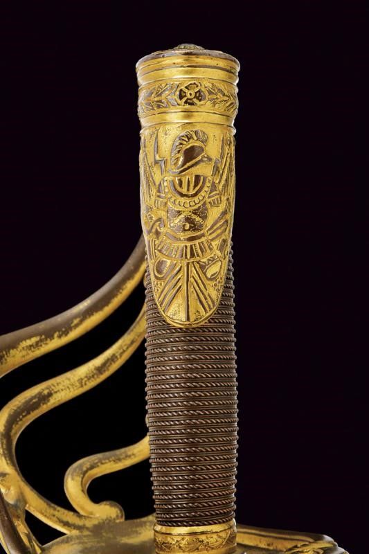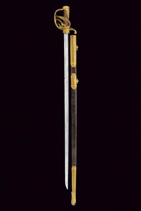 lunghezza 105,3 cm. 1850/60 Lama dritta a un filo e breve controfilo, doppiamente sgusciata a tutta lunghezza. Bel fornimento in bronzo che conserva parte della doratura antica. La ghiera di protezione del tallone ornata con fronde di quercia in rilievo. Cinque rami di guardia, quello principale munito di ramificazioni controcurvate e decorate a foglie alle estremità. Il braccio di parata controcurvato rispetto alla guardia e munito di testa a rosetta. Sul lato posteriore due rami che dal massello si congiungono a guardia e braccio di parata. Cappetta corta ornata con bel trofeo recante busto d'armatura e bandiere. Calottina ellittica incisa e intagliata a foglie. Il bottone in ferro con decoro scanalato. Fodero in cuoio probabilmente coevo (alcune scuciture sul retro), con fornimenti in ottone a due campanelle. Il puntale con piccola vela in ferro.