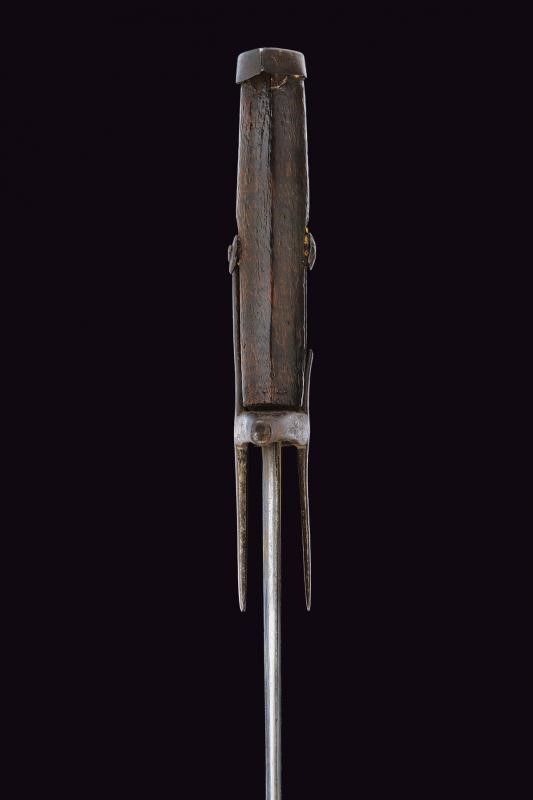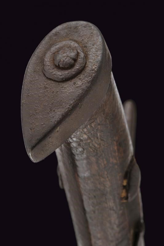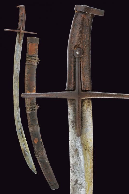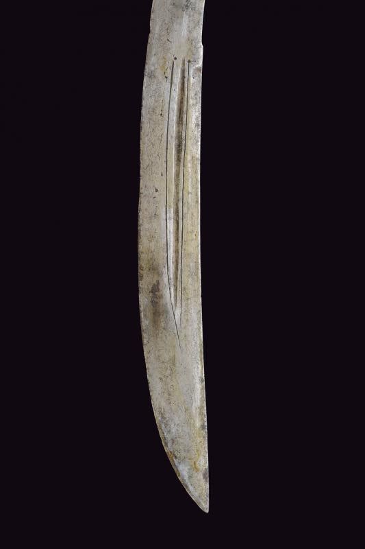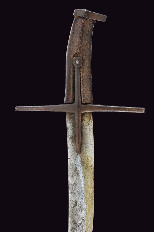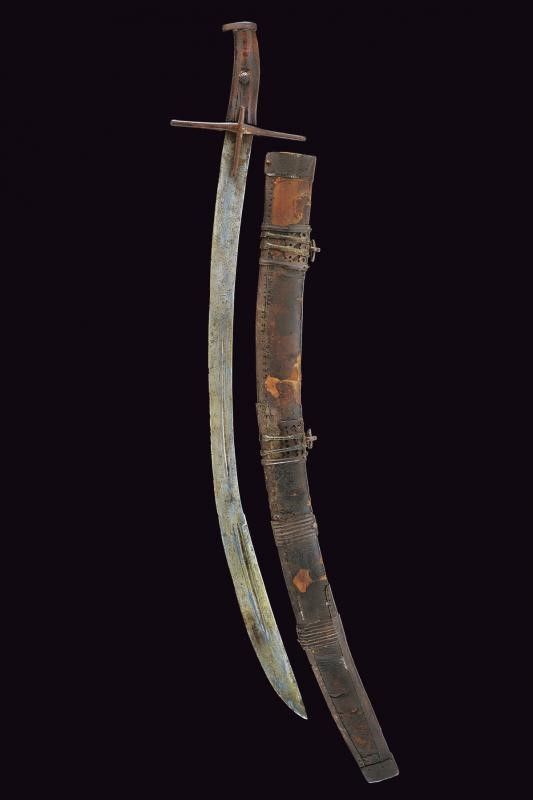 lunghezza 86 cm. XVII Secolo Lama curva a un filo e controfilo (varie intaccature), prima piatta, di seguito con una scanalatura decorata con due linee laterali. Fornimento in ferro a croce, uno dei segmenti longitudinali della croce (nella parte superiore) con mancanza. Tipica calottina appuntita. Impugnatura originale in legno con mancanza sotto alla punta del pomo. Fodero in legno rivestito di cuoio (varie mancanze) e con fornimenti in ferro. Due anelli di sospensione. Molto rara.
