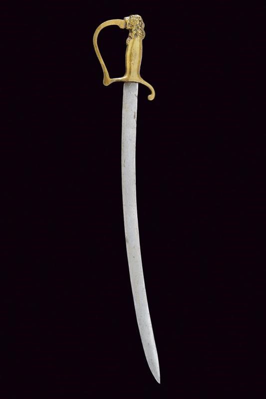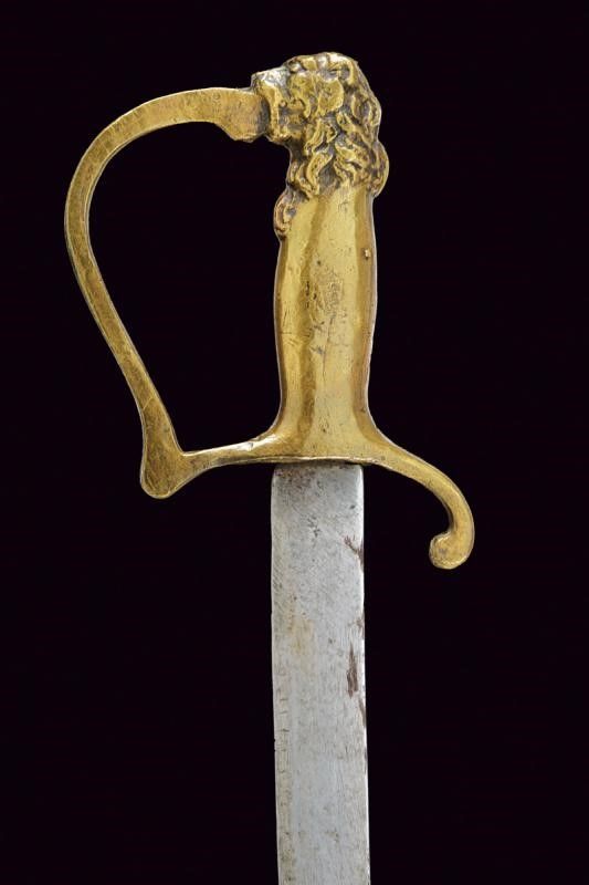Terzo quarto del XIX Secolo Lama curva a un filo, punta e breve controfilo. Fornimento e impugnatura in un unico pezzo d'ottone. Il primo con guardia a staffa, la seconda culminante in una testa di leone. Rara tipologia.