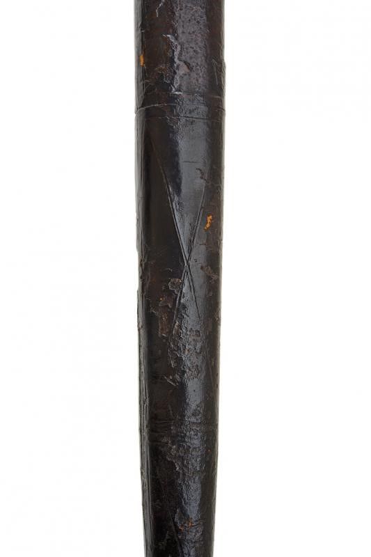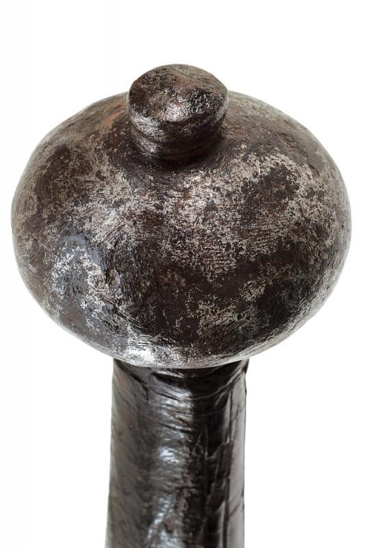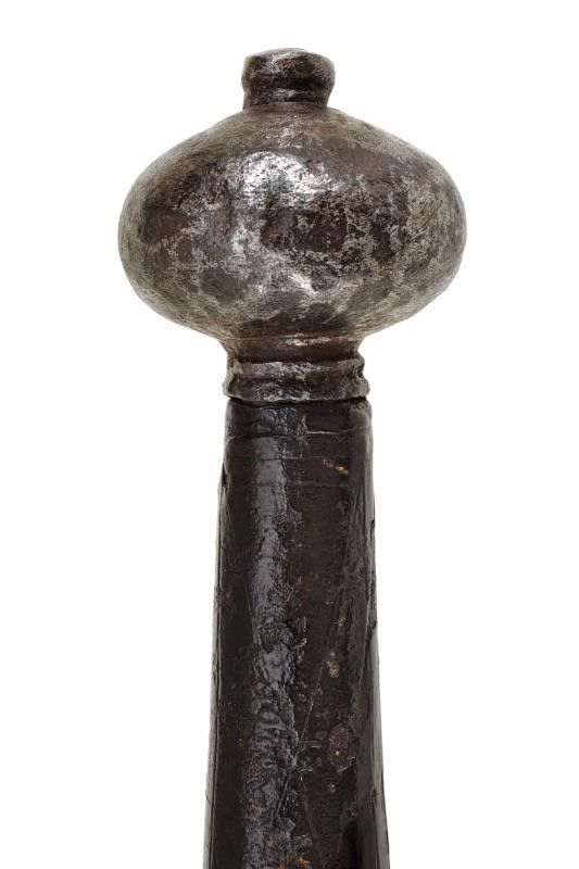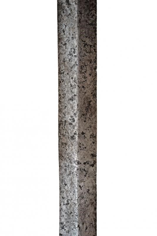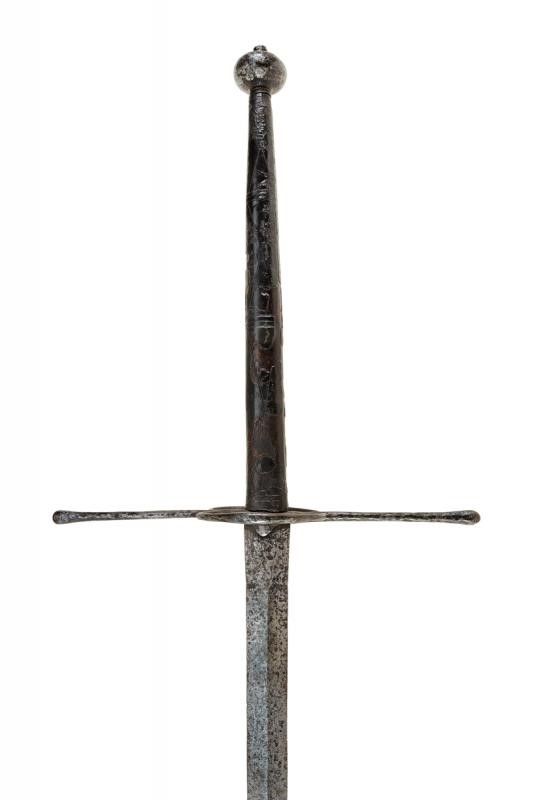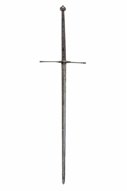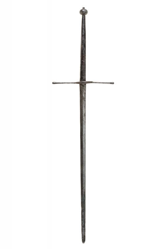 lunghezza 180.5 cm. Larga lama dritta a due fili costolata in mezzeria con tallone rettangolare, al centro ben visibile un grande punzone raffigurante un leone rampante. Elso in ferro a bracci dritti di sezione crescente verso l'estremità, il massello appuntito e con due grandi anelli ovali di parata. Lunghissima impugnatura in legno rivestita di cuoio originale (mancanze) decorato a motivi geometrici. Grande pomo in ferro a trottola.