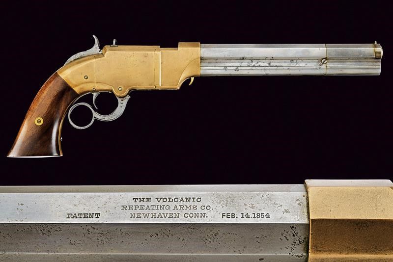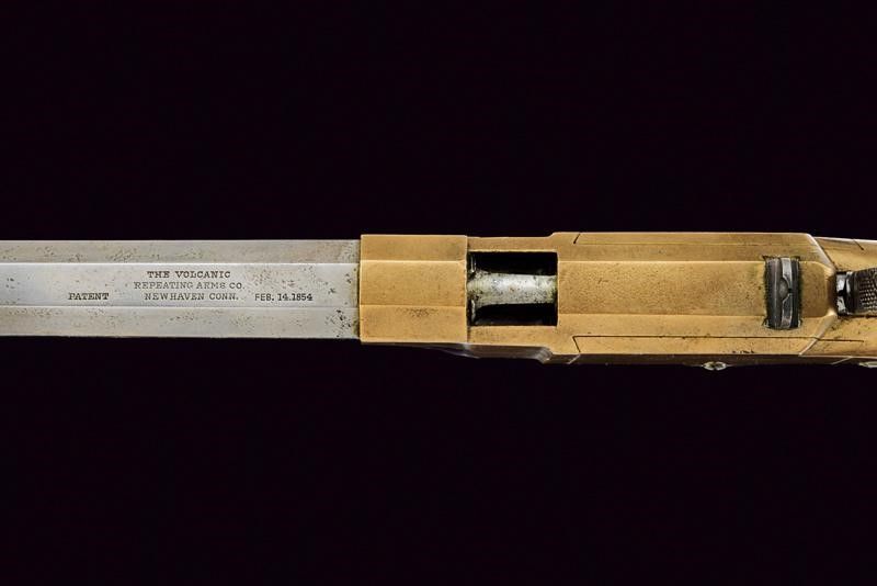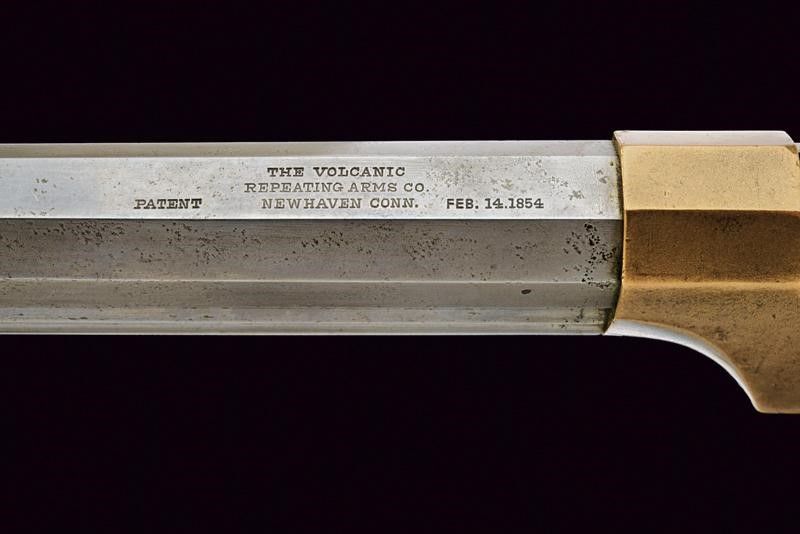 1860 circa Canna ottagonale da 8', con marcatura dorsale 'THE VOLCANIC REPEATING ARMS CO.', 'NEW HAVEN CONN.' e 'PATENT / FEB. 1854', cal. 41. Anima pulita, rigatura visibile, alcune intaccature soprattutto in volata. Castello in ottone. Carrello elevatore in ferro. Ponticello che funge da leva d'armamento, numerato '3xx'. Meccanica funzionante. Qualche intaccatura alle parti in ferro. Sezione ruotabile della canna per il caricamento funzionante, molla e cursore del serbatoio presenti. Guancette lisce in legno.