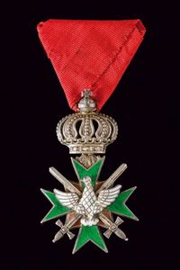dimensioni 3.7 x 6 cm. primo quarto del XX Sec. Croce da cavaliere, in argento smaltato con spade e corona, con [..]