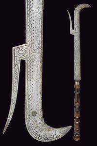 lunghezza 87.5 cm. Lunga lama a un filo con punta incurvata, al dorso nasce un lungo arresto leggermente controcurvato [..]