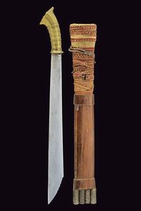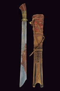Kalimantan, lunghezza 97 cm. inizio del XX Sec. Robusta lama dritta a un filo, di forma crescente verso il debole; [..]