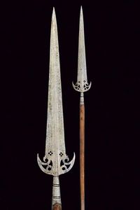 lunghezza 239 cm. Lunga lama a due fili con nervatura centrale. La base con ali e trafori. Gorbia troncoconica, [..]