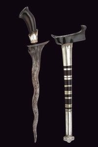 Giava, lunghezza 42 cm. XVIII/XIX Secolo Lama a due fili ondulati in pamor (del XVII secolo o pił antica), scanalata [..]
