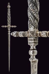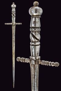lunghezza 34 cm. Lama dritta di sezione triangolare con nodo intagliato. Fornimento in ferro massiccio riccamente [..]