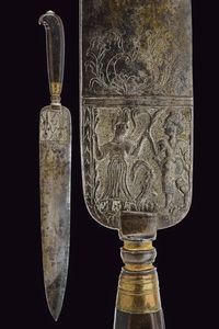 lunghezza 31,7 cm. Lama dritta a due fili, sgusciata al centro, recante al tallone pregiate raffigurazioni in [..]