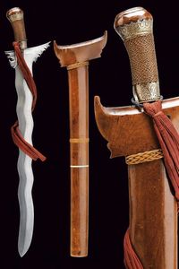 Sulawesi, lunghezza 66.8 cm. XVIII/XIX Secolo Lama dritta a un filo in pamor (XVIII o XIX secolo). Fornimento [..]