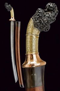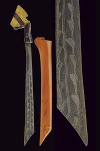 Borneo, lunghezza 55 cm. XIX Secolo Robusta lama dritta a un filo in bel pamor. Impugnatura in legno scolpito, [..]
