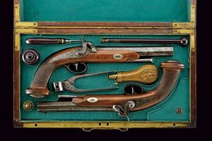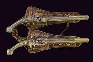 lunghezza 32,5 cm. Canne ottagonali rigate, dotate di mirino, cal. 13,6 mm. in volata. Resti di brunitura antica [..]