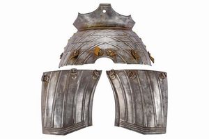 dimensioni various cm. In robuste lame di ferro decorato. Panziera per un petto tondo con quattro lame di falda [..]