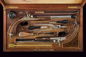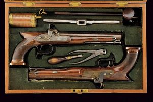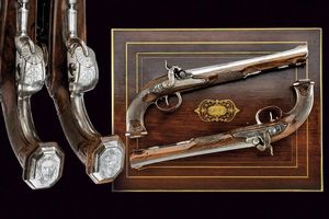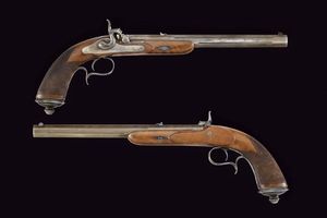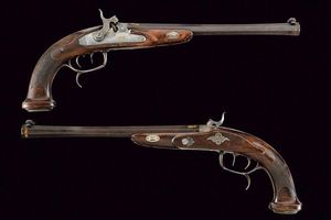 lunghezza 34,5 cm. Canne ottagonali rigate in bel damasco, dotate di mirino, numerate. Cal. 17,4 mm. in volata. [..]