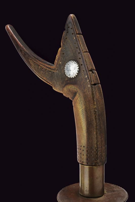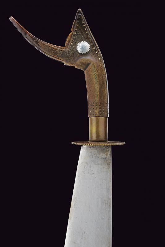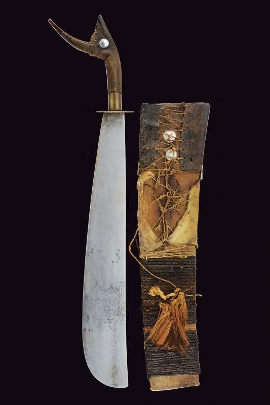 Luzon, lunghezza 58 cm. inizio del XX Sec. Larga lama crescente verso il debole, a un filo. Impugnatura di tipica foggia, in corno, con pomo angolato e dotato di penna, leggermente scolpita ed incisa; ghiera ed elso in ottone. Fodero in legno rivestito di cuoio e fibra vegetale.