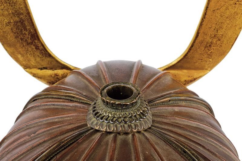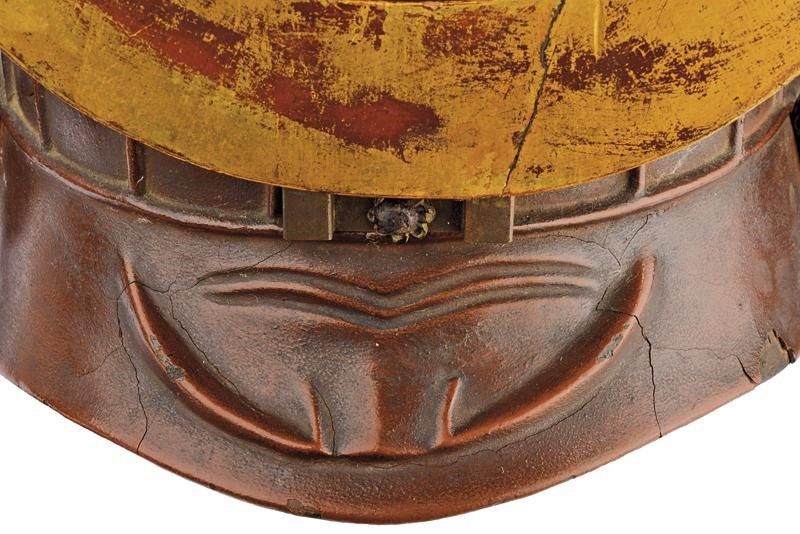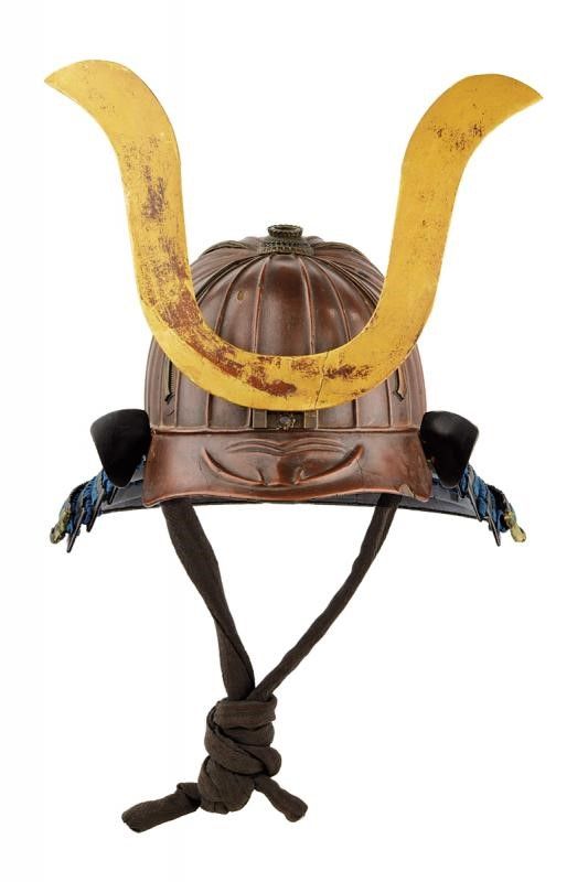 altezza 36 cm. Periodo Edo (1603-1867) Akoda-nari Hachi composto da 22 piastre di ferro con finitura rugginosa (mancanze) e decorazioni shihoujiero. Hachimanza alla sommità. Mabizashi con disegno in rilievo, rifinita internamente in lacca rossa; doppio Tsunomoto. Piccoli Fukigaeshi in lacca nera. Shikoro a quattro piastre con allacciatura color blu. Interno con Ukebari e Shinobi-no-o. Maedate originale di Kuwagata in legno dorato. Metà del periodo Edo.