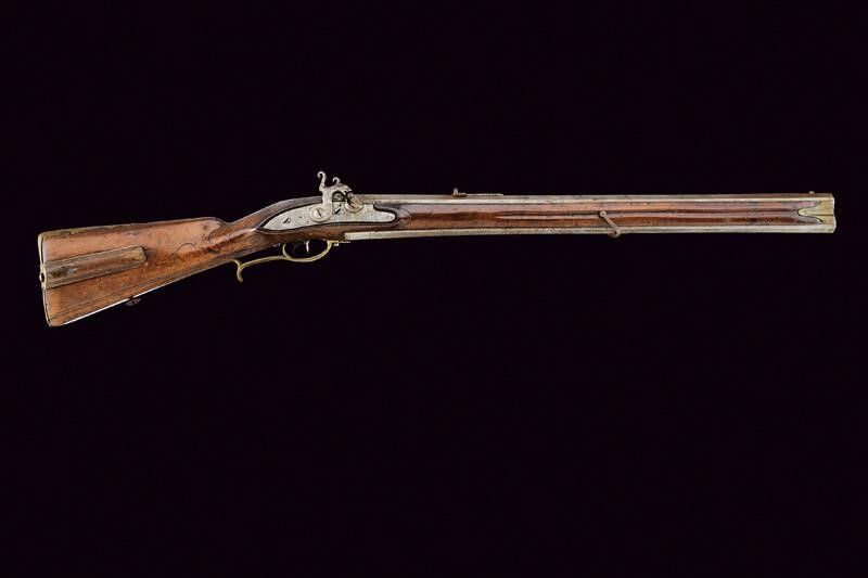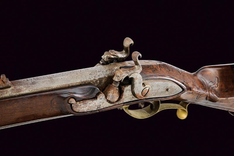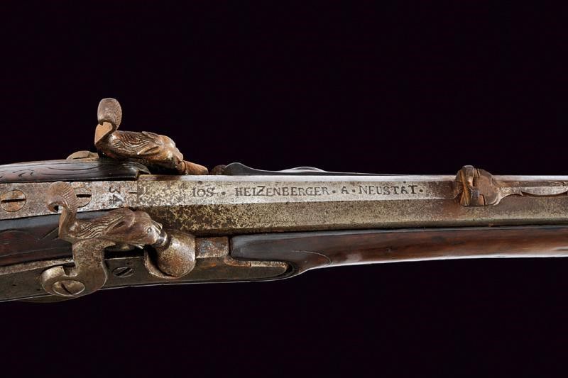 Due pesanti canne ottagonali, sovrapposte: quella superiore rigata, firmata 'IOS HEIZENBERGER A NEUSTAT', dotata di mirino e alzo a una foglietta fissa e una abbattibile in ferro, cal. 14 mm. La canna inferiore liscia, cal. 15,2 mm. Codolo numerato '34'. Batterie a cartella piatta, interamente in ferro, entrambe funzionanti a due scatti, convertite a luminello con bei cani a forma di pesce. Cassa intera in legno in buono stato (piccole intaccature), recante delineature e incisioni a volute, la pala munita di poggiaguancia e patchbox in legno. Fornimenti in ottone. Ponticello e doppio grilletto. La canna superiore con zone di ruggine. Interessante.