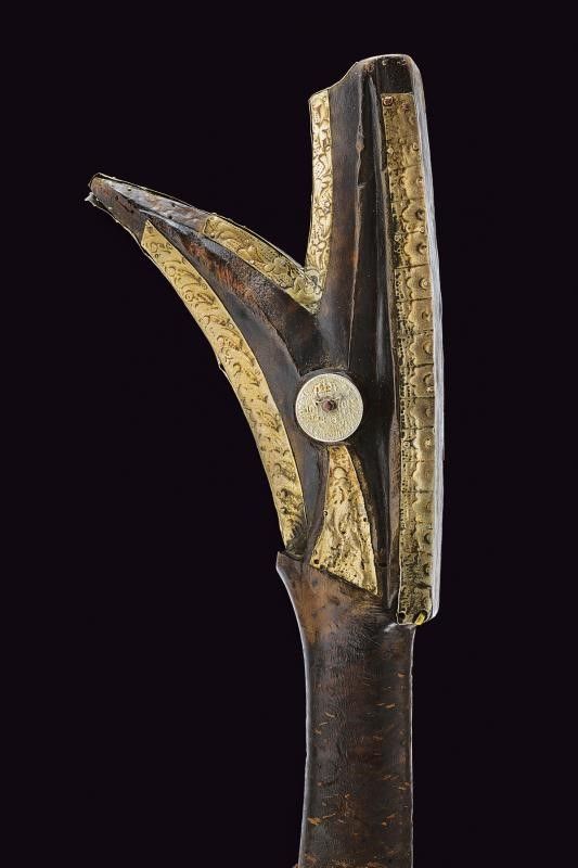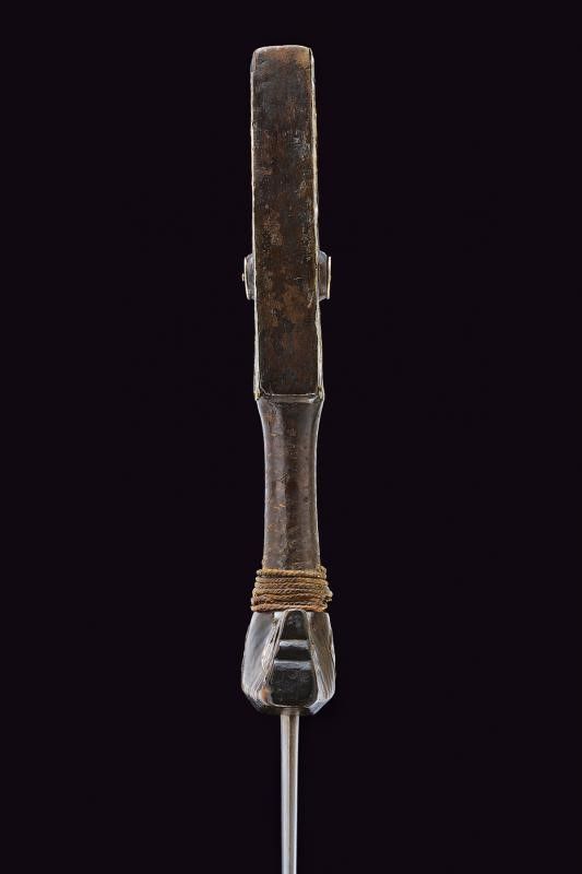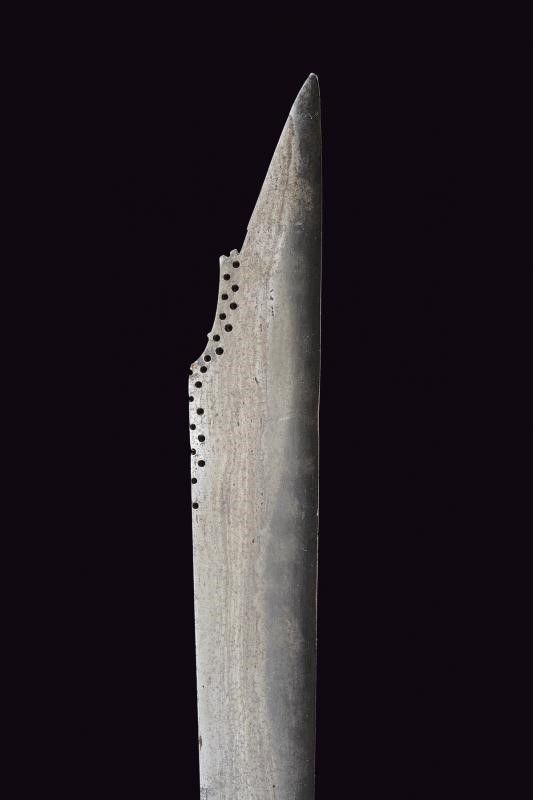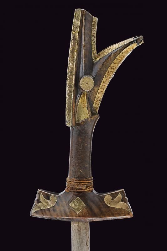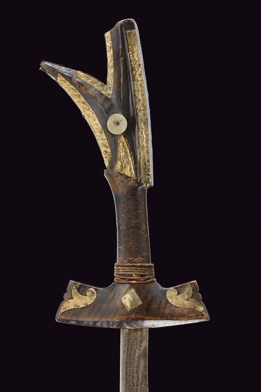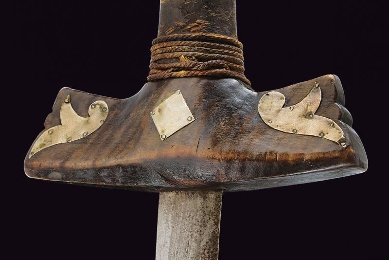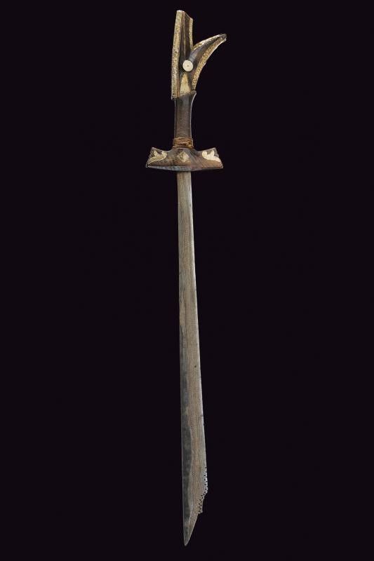 Mindanao, lunghezza 98.5 cm. XVI - XVIII Secolo Bella lama dritta a un filo (del XVI secolo o antecedente), in fine pamor, con punta triangolare dotata di dorso decorato a intagli e trafori. Imponente fornimento in legno (del XVIII secolo) con fornimenti in lamina d'argento, due monete e resti di rivestimento. Privo di fodero.