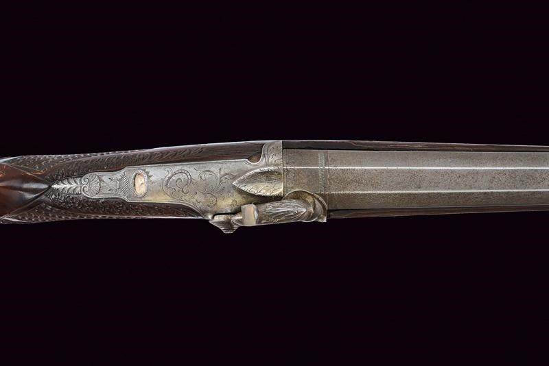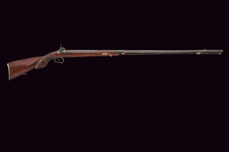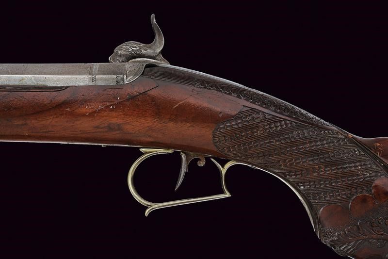 Canna liscia a due ordini, ottagonale e tonda (un paio di piccole crepe), con culatta ornata con cornicette incise, anellature al cambio, mirino in metallo color argento, volata leggermente strombata, cal. 17,8 mm. Interessante meccanica con batteria interna, incassata nel collo della cassa e integrata nell'ampio codolo. Questo dotato di traguardo a sella, inciso a fiorami e recante cartiglio rimesso in argento marcato con la firma 'A. Bagnoli'. Il cane inciso e intagliato. Meccanica funzionante ma il cane non tiene gli scatti. Mezza cassa in legno con segmenti intagliati a squame e bande longitudinali. Nella parte inferiore della pala un bel volto barbuto scolpito. Fornimenti in metallo bianco parzialmente incisi a motivi floreali. Bacchetta in legno in due segmenti, battipalla in ottone.