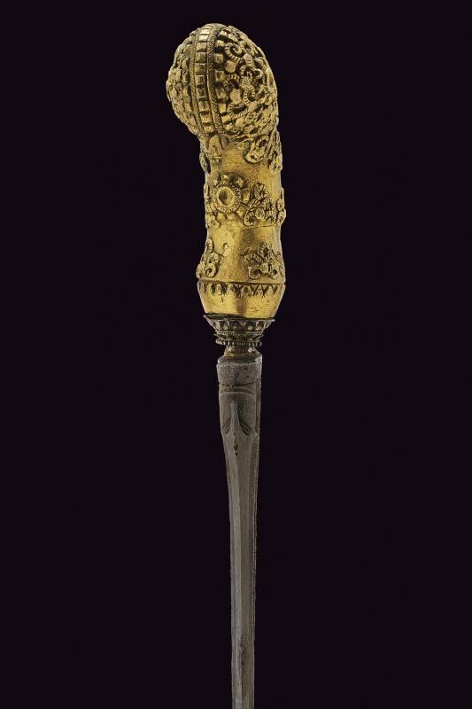 Banjarmasin, lunghezza 47 cm. XVIII/XIX Secolo Lama a due fili ondulati, con forte nervatura centrale e duplice scanalatura, quest'ultima si raddoppia alla base, la quale è decorata anche ad intagli; zone con danni da ruggine. Ukiran in ottone massiccio riccamente decorato a intagli ed incisioni floreali. Mendak in metallo decorato in filigrana. Fodero con piccolo wrangka. Il gandar rivestito con pendok in rame dorato e decorato con bande a lisca di pesce.