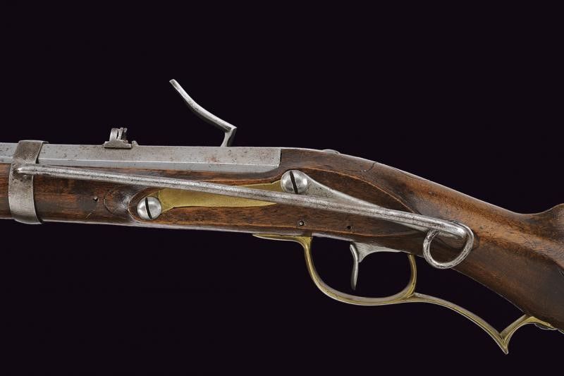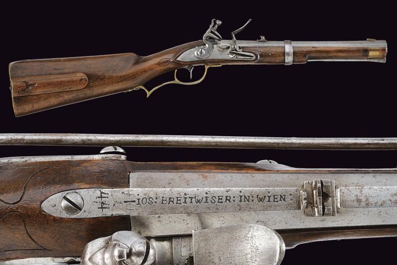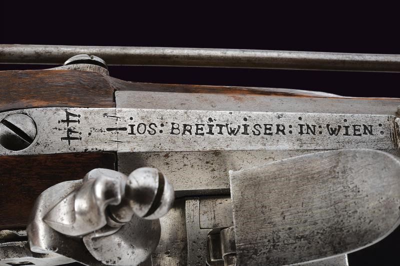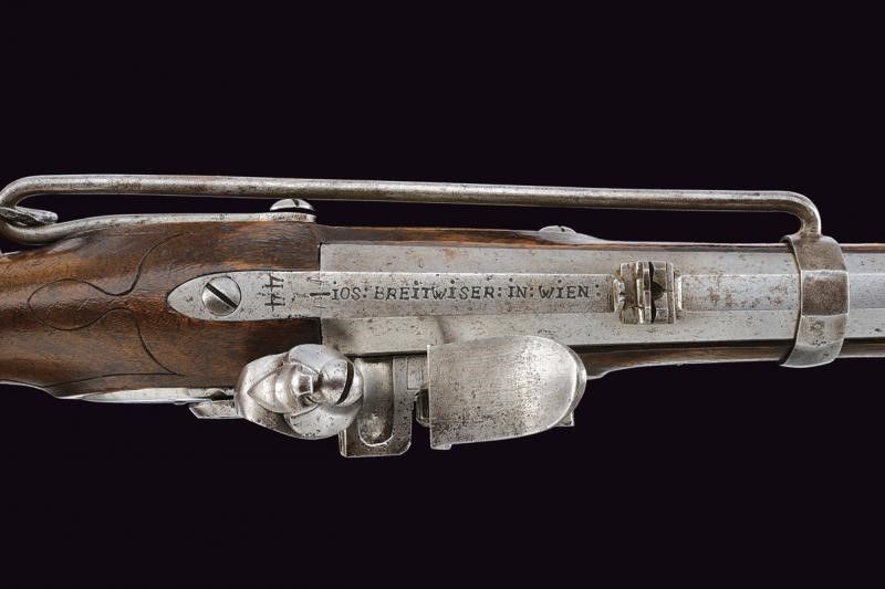 lunghezza 71 cm. Canna ottagonale rigata (anima pulita, rigatura ben visibile), munita di culatta con marcatura 'IOS : BREITWISER : IN : WIEN :', alzo a due fogliette (una delle quali abbattibile), mirino di precisione in ottone; cal. 15.9 mm. Codetta liscia numerata '44'. Batteria a pietra focaia con cartella piatta e con bordi obliqui, cane a collo di cigno, al di sotto della molla della martellina è impressa la lettera 'B'. Rottura facilmente riparabile del vitone del cane. Cassa intera in legno di noce; calcio con patch-box, un cavastracci e un dosatore di polvere. Fornimenti in ottone; gancio, anello da sella e bacchetta in ferro. Meccanica da rivedere.