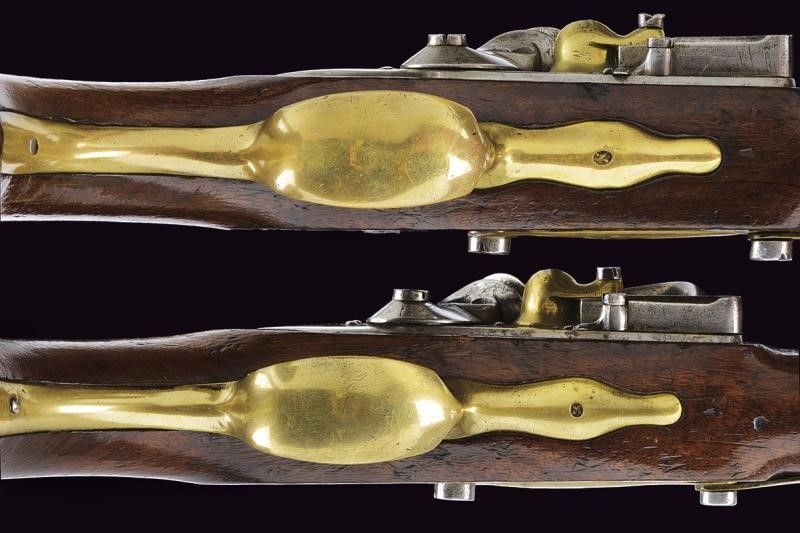 lunghezza 35,5 cm. Canne tonde lisce punzonate 'P', 'M' e con altri marchi, cal. 17,1 mm. in volata. Batterie sul tipo francese con cartella marcata 'BRESCIA' e scodellino in ottone. Casse a tre quarti in legno con timbri d'ispezione militare, ancora visibili le date '1806'. Fornimenti in ottone. Ponticelli punzonati 'M' come anche gli altri fornimenti. Bacchette in ferro.