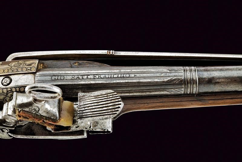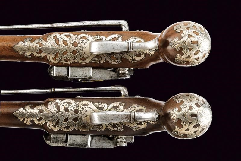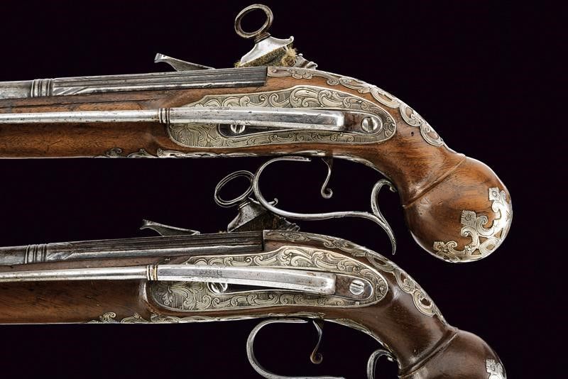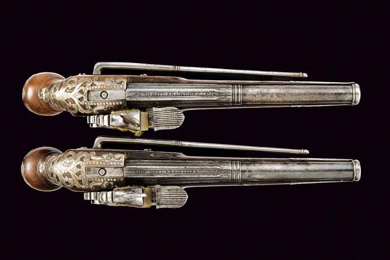 lunghezza 32 Canne lisce a due ordini; la prima parte ottagonale con scanalature longitudinali e firma 'GIO BATT FRANCINO', la seconda parte tonda con due anellature al cambio e con gioia di bocca in volata; cal. 13 mm. La vite della codetta intagliata a fiore. Batterie firmate 'Ignatius Raneri' ed incise con facce grottesche e fiorami, i bordi con linee ondulate. Casse intere in legno, il calcio con tipico pomo sferico. Fornimenti in argento intagliati, incisi e parzialmente traforati a motivi floreali e geometrici. Ponticelli con poggiadito, in ferro, come anche i ganci da cintura e le bacchette.