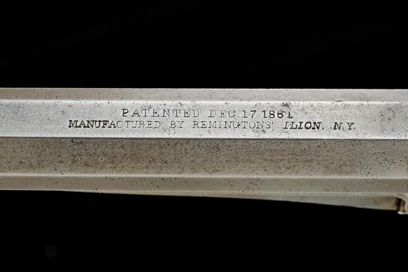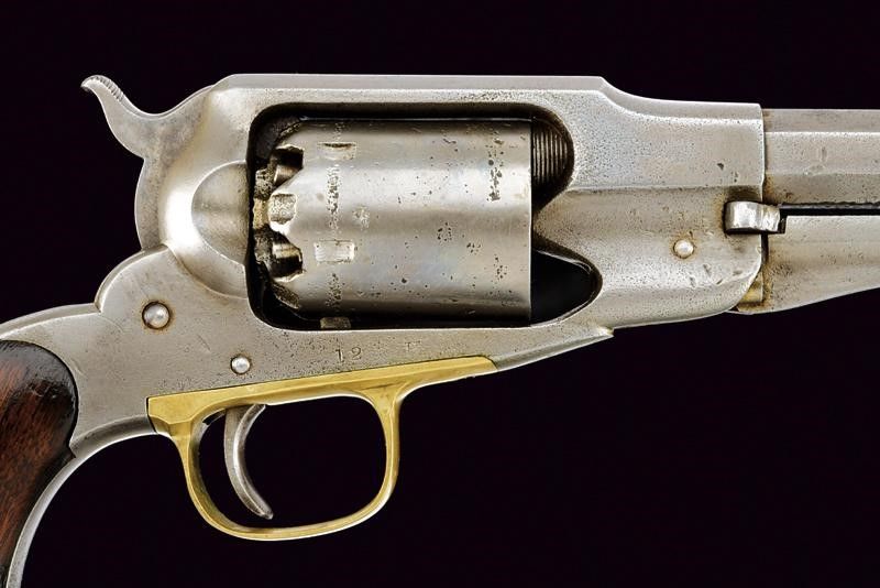 USA, lunghezza 33,5 cm. 1862 Canna ottagonale rigata da 7-3/8', dotata di mirino conico, recante al dorso la marcatura in due righe standard, con punzone 'B', cal. 36. Anima pulita rigatura visibile, lievi intaccature all'interno. Tamburo a sei colpi punzonato con forti intaccature. Meccanica funzionante. Ponticello in ottone. Castello punzonato '12 H'. Segni d'uso e del tempo e intaccature. Matr. '21xxx' su canna e impugnatura. Guancette in noce.