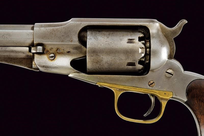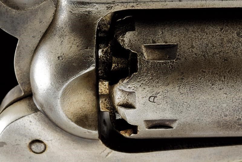 1863 - 1878 Canna ottagonale rigata, dotata di mirino, marcata in tre righe con brevetto del 1858, indirizzo della ditta e 'NEW-MODEL', cal. 36. Rigatura visibile, qualche intaccatura all'interno. Tamburo liscio a sei colpi, punzonato 'D'. Ponticello in ottone marcato 'E3'. Piccola mancanza vicino al calcatoio solo sul lato sinistro. Castello marcato 'C'. Matricola '34XXX' sotto alla canna e nell'impugnatura. Meccanica funzionante. Guancette in legno. Intaccature, segni d'uso e del tempo.