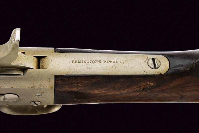 Canna rigata (anima pulita, rigatura visibile), tonda con base ottagonale, marcata 'WESTLEY RICHARDS & CO. BIRMINGHAM', '40', '38', 'A.', punzone del banco di prova di Birmingham, matricola '83xx' e chiavi decussate del Vaticano, alzo abbattibile e regolabile, mirino e attacco per la baionetta, calibro 12 mm in volata. Tipico castello ed otturatore con matricola coeva, codetta marcata 'REMINGTON PATENT'S'. Meccanica funzionate. Calcio ed astina in legno con fornimenti in ferro. Calciolo lavorato come il modello 51 cantonale. Calcio con piccole mancanze. Completo di baionetta a yatagan con fodero in ferro.