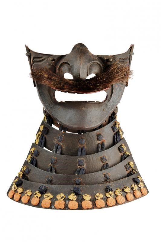 altezza 24.5 cm. Periodo Edo (1603-1867) Del tipo me-no-shita-men, struttura in ferro, con rughe ed espressione molto pronunciate. Grande naso rimovibile. Bocca aperta con baffi. Orecchie con rosetta traforata. Interno laccato color rosso (piccole mancanze). Yodare-kake a quattro lame con allacciatura in stile sagake.