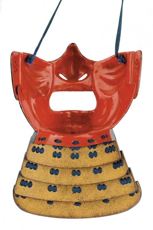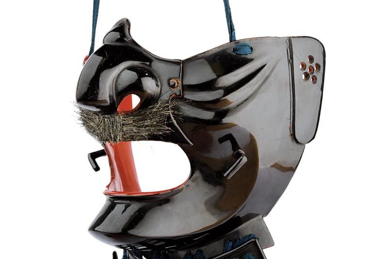 altezza 25 cm. Periodo Edo (1603-1867) Del tipo me-no-shita-men, con rughe di espressione e mento pronunciato, grande apertura della bocca priva di denti, baffi, le orecchie traforate con rosetta; laccato in color nero esternamente e rosso internamente, all'interno resti di una firma. Yodare-kake con quattro lame in ferro, internamente laccate in oro in stile nashiji, ogni lama decorata con quattro kikko-mon.