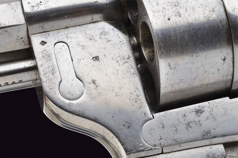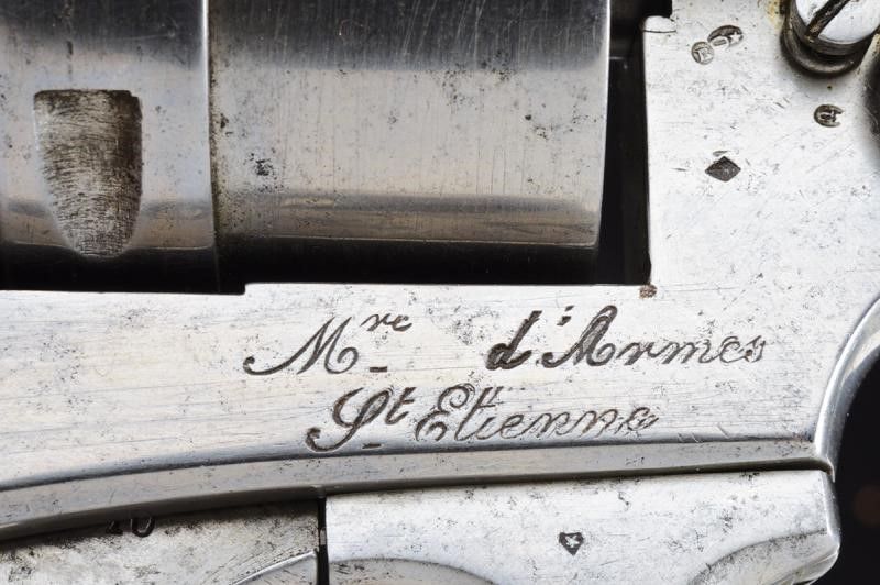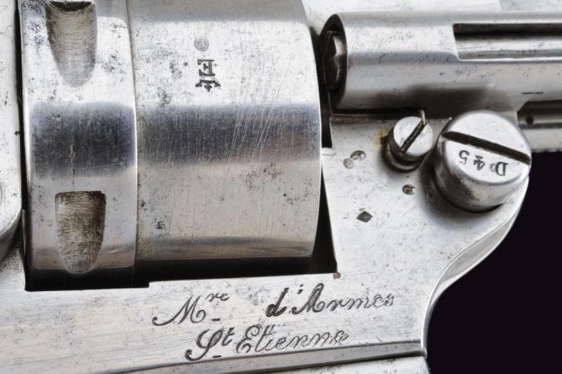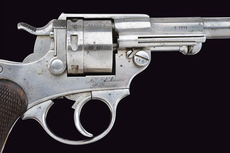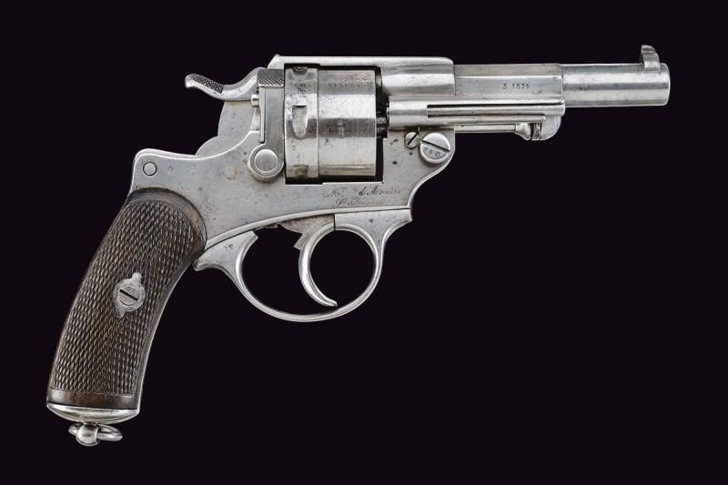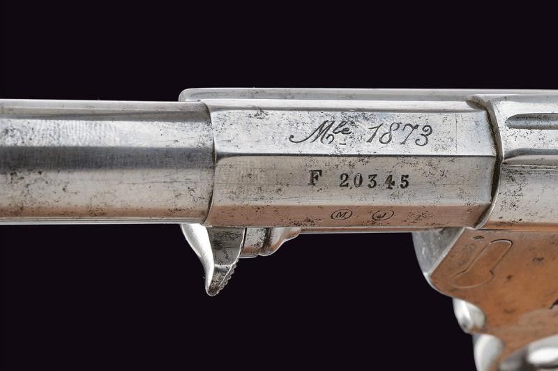 Canna a due ordini, ottagonale e tonda, dotata di mirino, recante le marcature 'S.1874', 'Mle 1873', punzoni e matricola 'F203xx', cal. 11 mm; tamburo liscio a sei colpi, punzonato con 'E' coronata e con la stessa matricola. Castello recante punzoni, matricola e dicitura 'M.re d'Armes St. Etienne'; guancette in legno zigrinato, estrattore laterale, anello porta correggiolo. Meccanica funzionante.