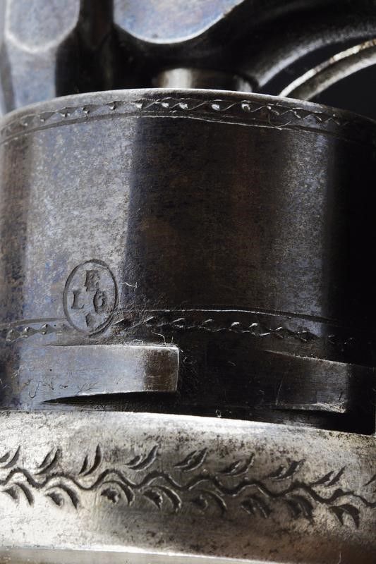 lunghezza 19,8 cm. Canna tonda rigata dotata di mirino, recante marcatura 'MARIETTE B.TE' e punzonata, cal. 7 mm. Tamburo a sei colpi, punzonato. Castello inciso a racemi, grilletto ad anello. Meccanica a doppia azione funzionante. Guancette in legno. Canna e tamburo conservano il 70% circa della brunitura antica.