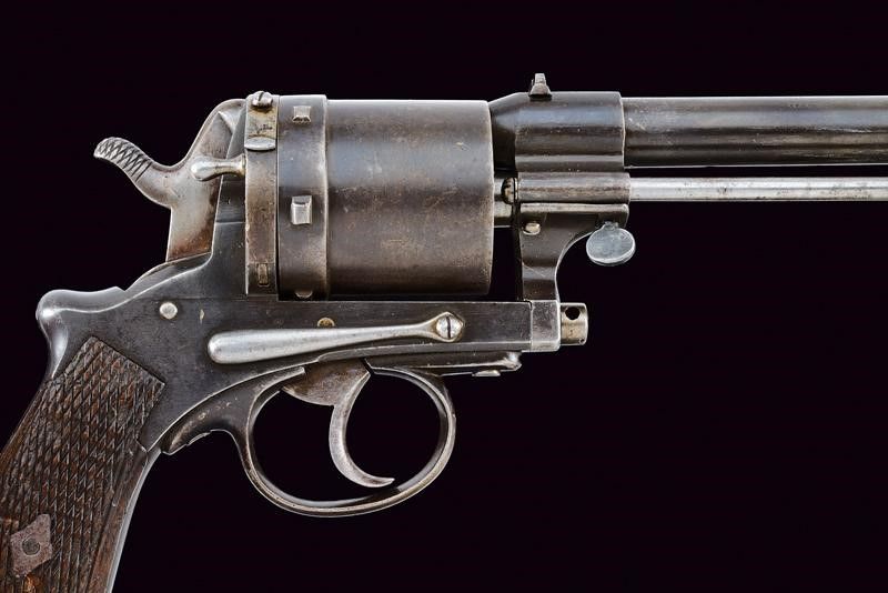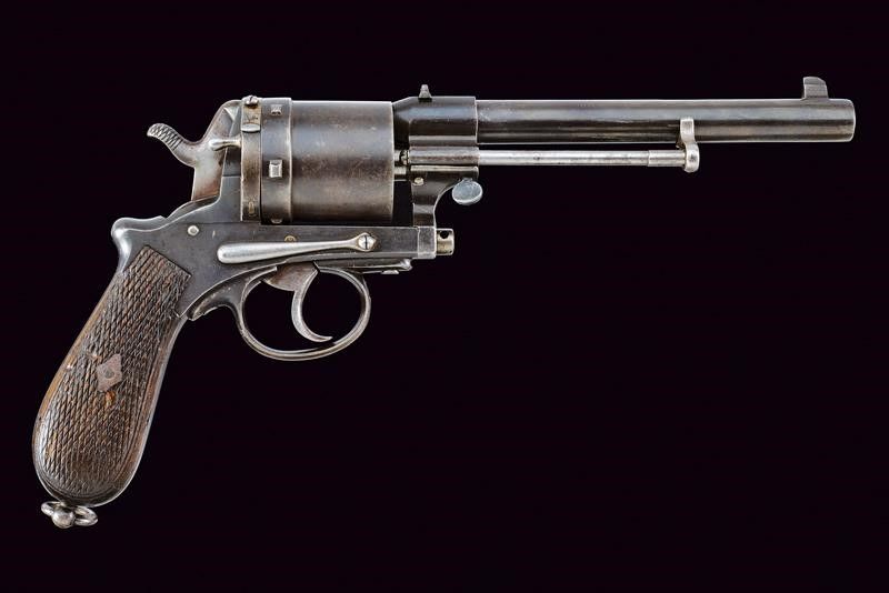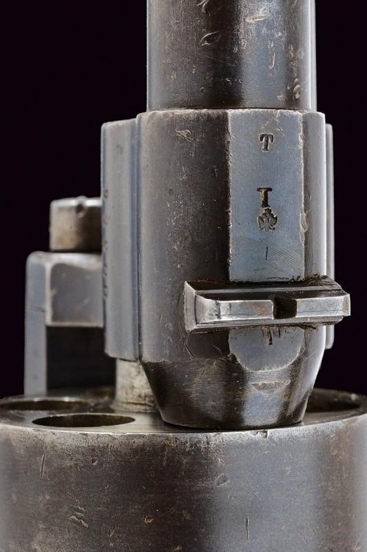 lunghezza 34.5 cm. Canna cilindrica rigata (anima pulita, rigatura ben visibile), dotata di mirino e tacca di mira, la culatta con punzoni 'T', aquila bicipite; cal. 11 mm. Tamburo liscio a sei colpi. Meccanica funzionante. Castello con marcatura '14 TD 256' (probabilmente numeri di reparto) e con matricola '23xxx'. Impugnatura con guancette zigrinate in legno. Anello porta correggiolo. (Ribrunita?).