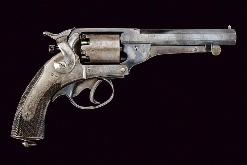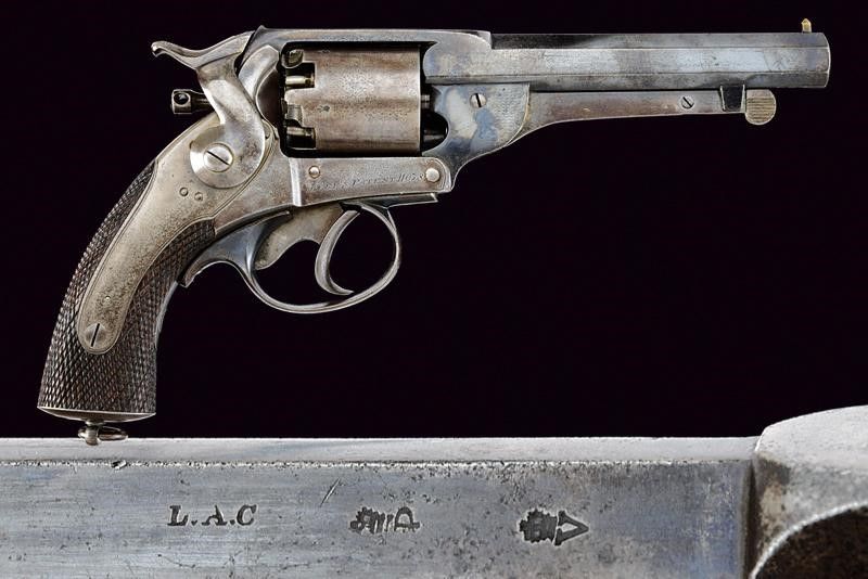 1861 - 1865 Canna faccettata, rigata, con mirino in ottone, recante al dorso sigla 'L.A.C.' e punzoni del banco di londra; cal. 44. Anima molto ben pulita e rigature nette. Tamburo a cinque colpi con punzoni del banco di prova di Londra. Meccanica funzionante solo in singola azione. Castello con dicitura 'LONDON ARMOURY', 'KERR'S PATENT' e numero di serie '11xxx', lo stesso numero presente sul tamburo. Batteria a molla indietro. Impugnatura zigrinata in legno. Qualche lieve zona intaccata, ma superfici in buono stato, con resti di antica brunitura color blu al 35%.