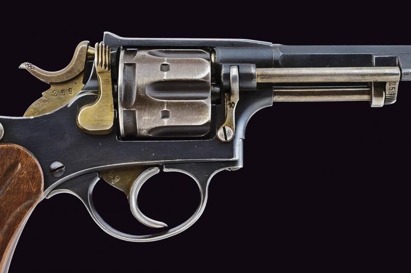 lunghezza 26 cm. Canna ottagonale, rigata, con matricola '19xxx' e '7.5 mm', mirino, cal. 7.5 mm; castello numerato en suite e con vari punzoni e croce elvetica, tamburo scanalato a sei colpi, sportellino di caricamento ed estrattore. Guancette in legno scanalato. Anello porta correggiolo. Brunita.