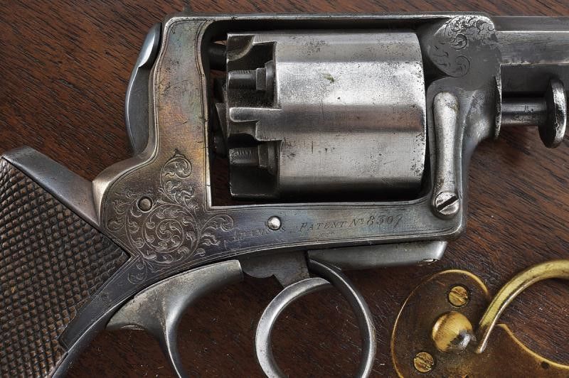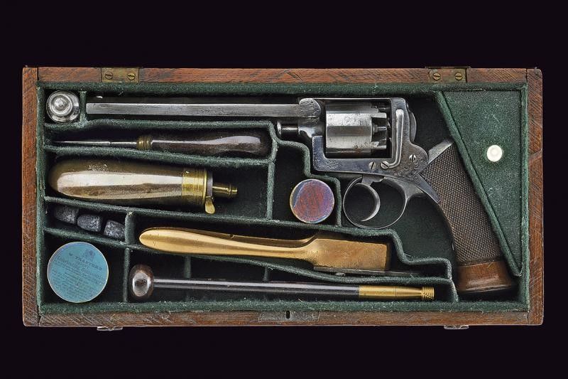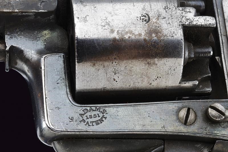 lunghezza 28,5 cm. Canna ottagonale rigata dotata di mirino, marcata al dorso 'MANUF.D BY PIRLOT BROTHERS LIEGE ... BY DEANE ADAMS & DEANE LONDON' (la parola al centro non leggibile), cal. 11 mm. in volata. Varie intaccature e incrostazioni all'interno. Tamburo a sei colpi con punzone 'PF'. Castello con incisioni a racemi e marcatura del brevetto Adams. Meccanica funzionante, rotazione da rivedere. In una cassetta in legno con interno in panno verde (rifoderato?) e munita di alcuni accessori.