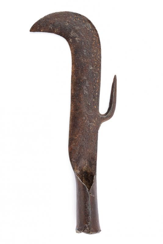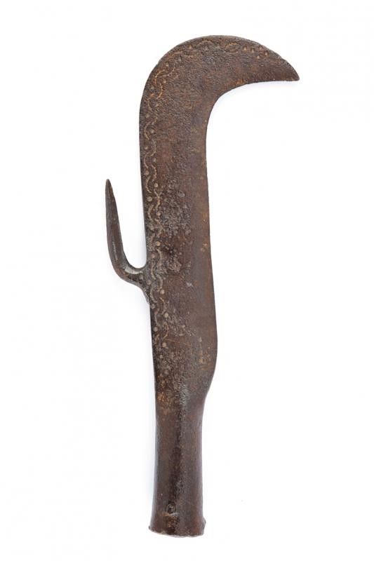 Robusta e larga lama con taglio sul lato incavato e con punta incurvata. Sul dorso un arresto di sezione a losanga, la superficie dorsale decorata con incisioni a semicerchi dentati su entrambi i lati. Gorbia troncoconica.