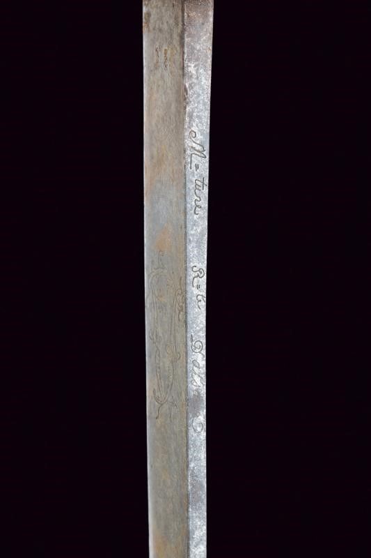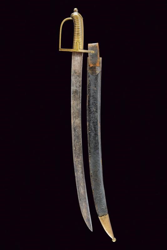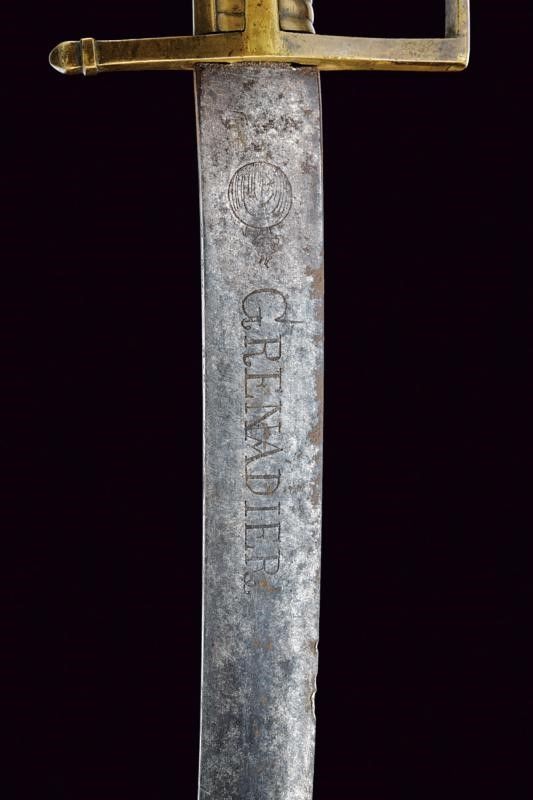 lunghezza 72,5 cm. Seconda metà del XVIII secolo Lama curva marcata 'GRENADIER' e con emblema a granata fiammeggiante, recante i punzoni 'B' e 'J' coronati, al dorso l'iscrizione 'M.ture R.le d'Alsace (parzialmente intaccata). Su una faccia monogramma speculare a 'L' (Luigi XV?) Fornimento con elso e guardia in ottone recante punzoni en suite con la lama. Fodero in cuoio con puntale e cappa in ottone.